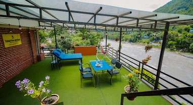 Serene river-facing private balcony at Trishuli River Side Resort, an ideal space for families to relax and enjoy together. Overlooking the flowing T…